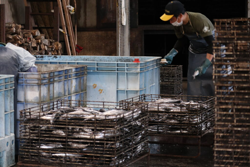 仕分け後は熱湯に浸け、約1時間煮る。「カツオと違って身を割かないで丸ごと煮るから旨みが閉じ込められる。出汁は唸るほど美味しい」と語るのは、宗田節に魅了されて妻・早苗さんの実家である「たけまさ商店」を継ぐ島谷真矢さん。