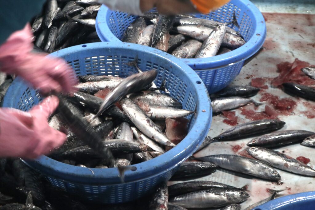 納屋の中では毎日およそ3tから4tほどのマルソウダが8人の手によって大きさ別に仕分けされていく。圧倒される手際の良さだ。