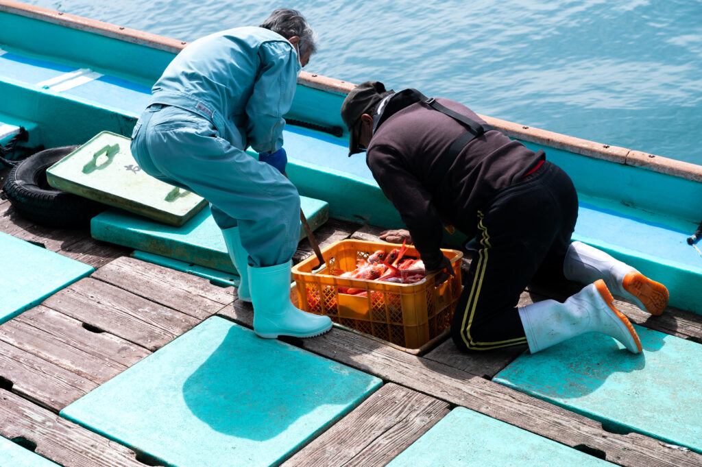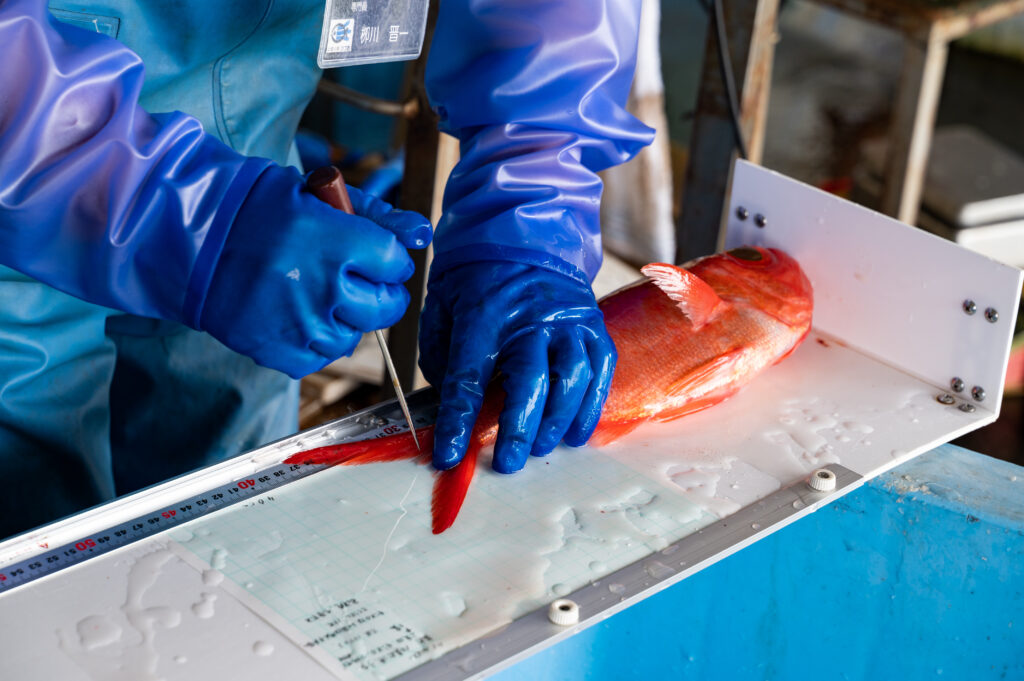 港に戻った船から金目鯛が揚がるとサイズごとに仕分けられ、手早く氷水の中に入れられてゆく。