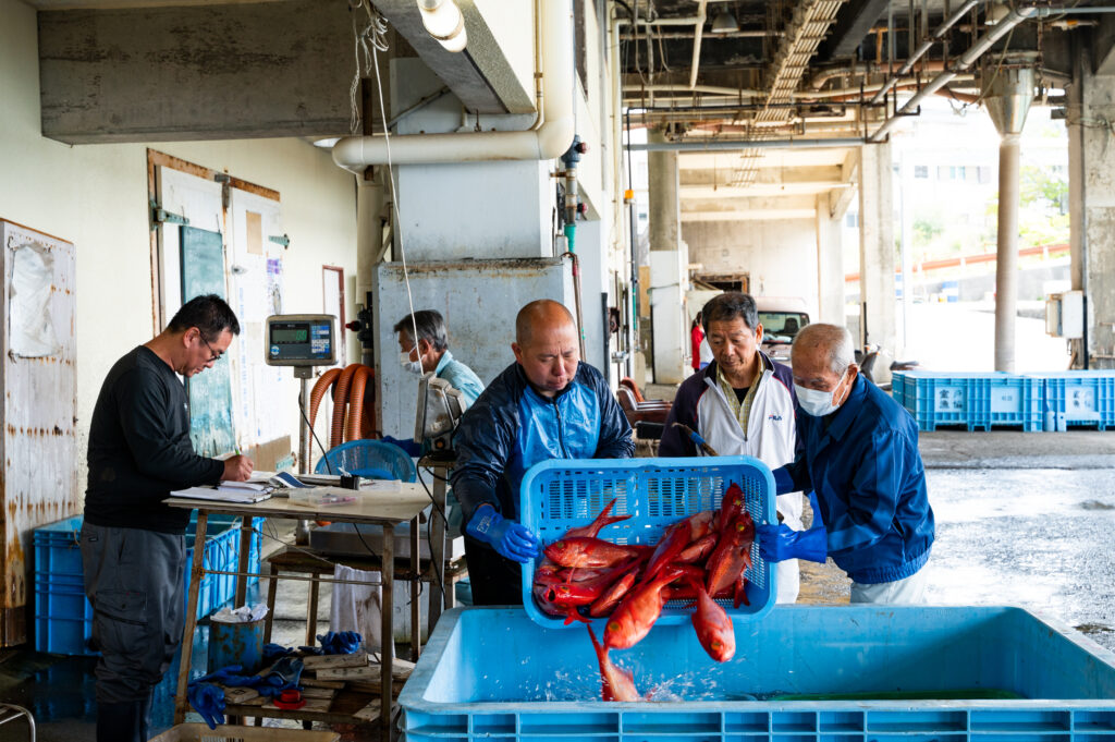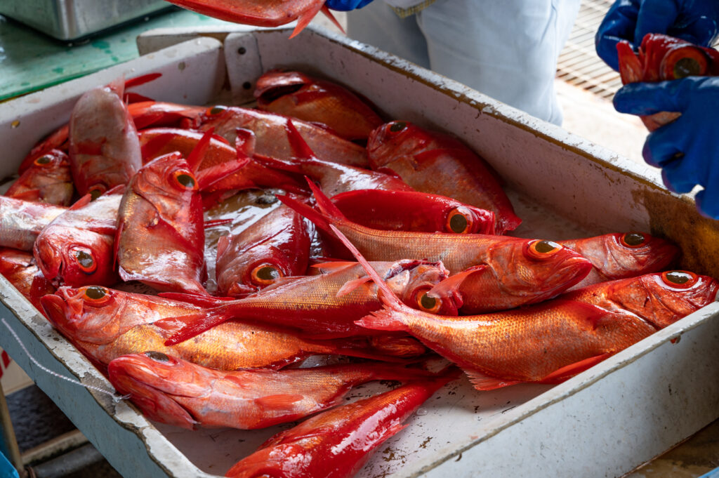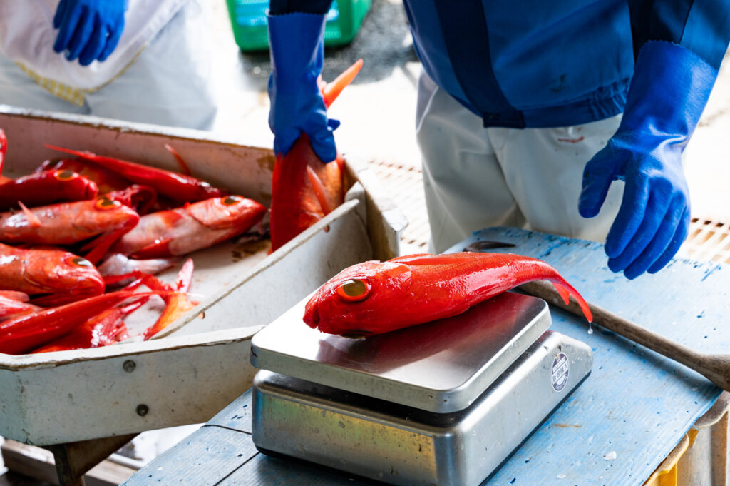 水揚げされたばかりの金目鯛。陸にあがるとじわりと赤みを帯びてゆく