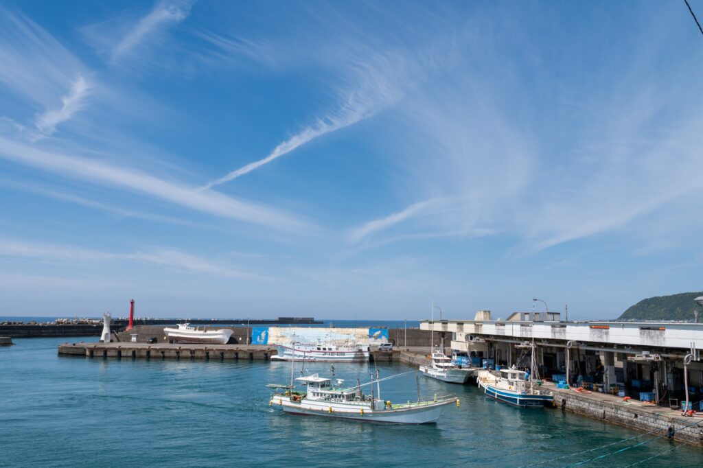 水揚げの場面を押さえるべく、私たちが室津港を訪れたのは朝9時半頃。目の前に広がる水平線は多島海である瀬戸内にはない風景。遠くからでも戻って来る漁船がよく見えた。